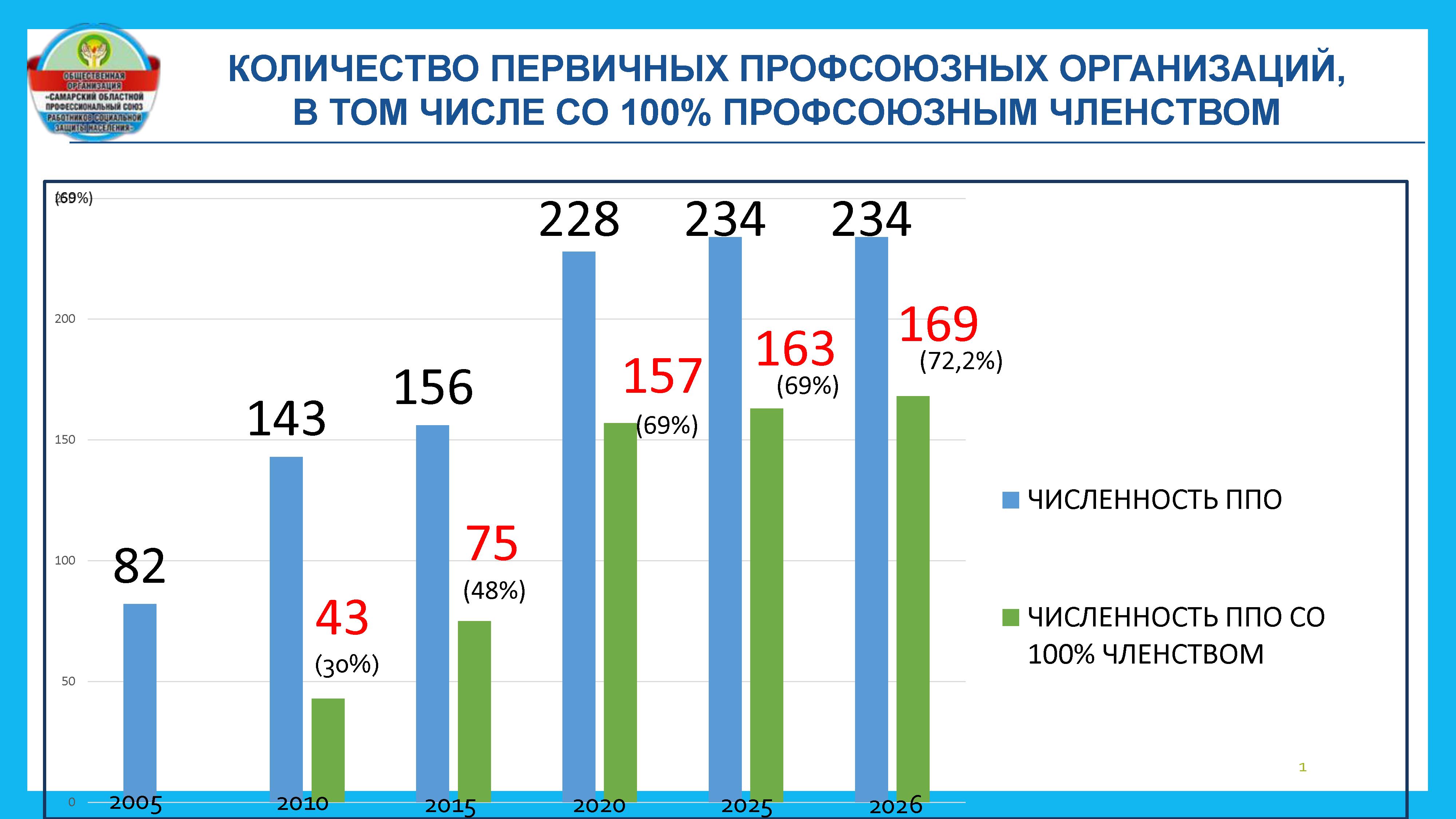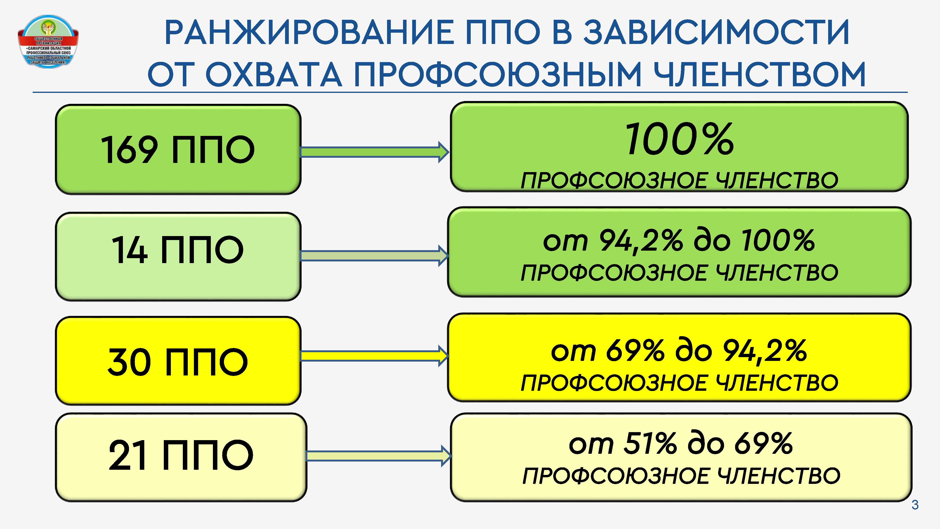 169 первичные профсоюзные организации имеют 100% охват профсоюзным членством (72% от общего числа ППО)