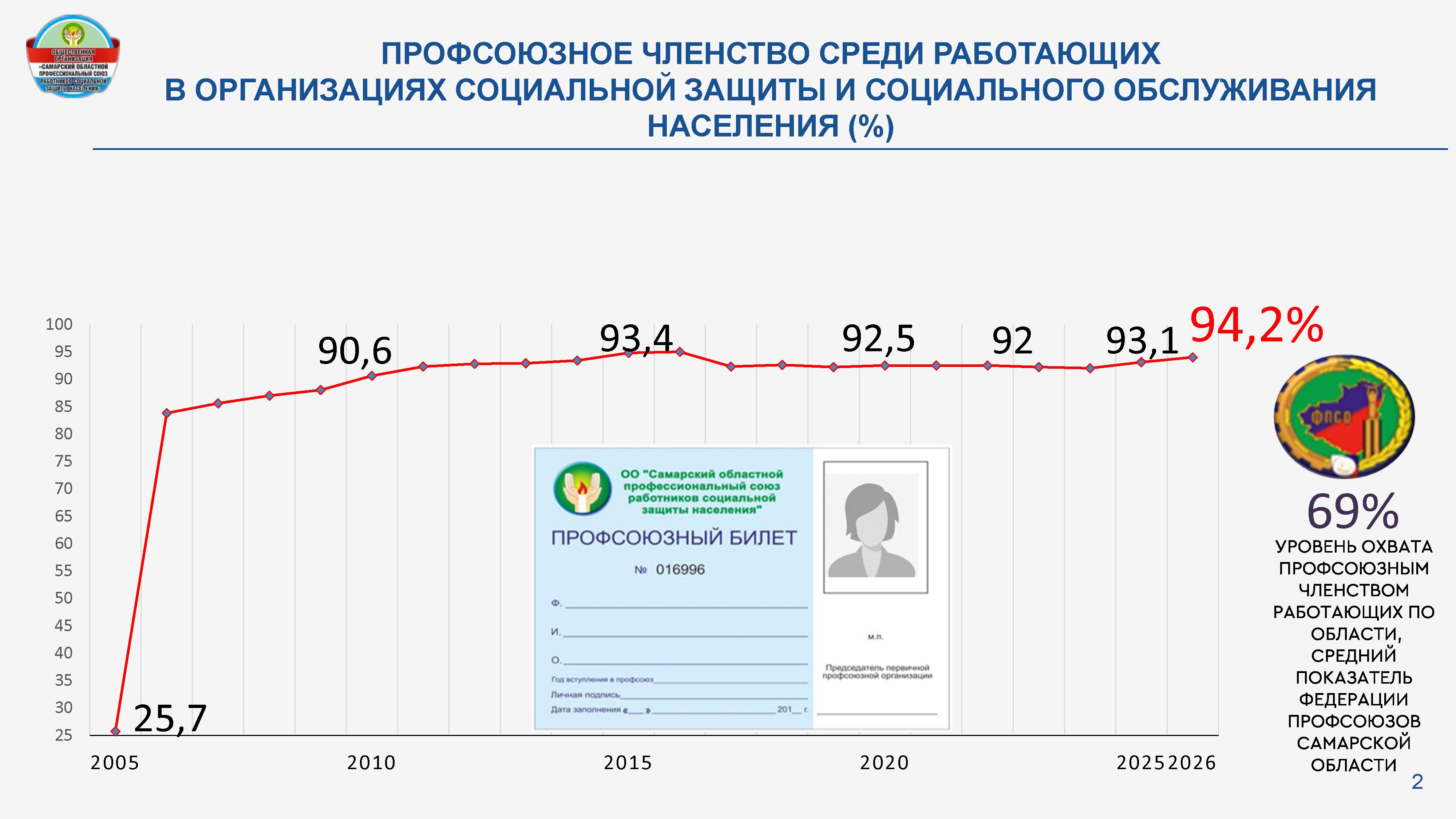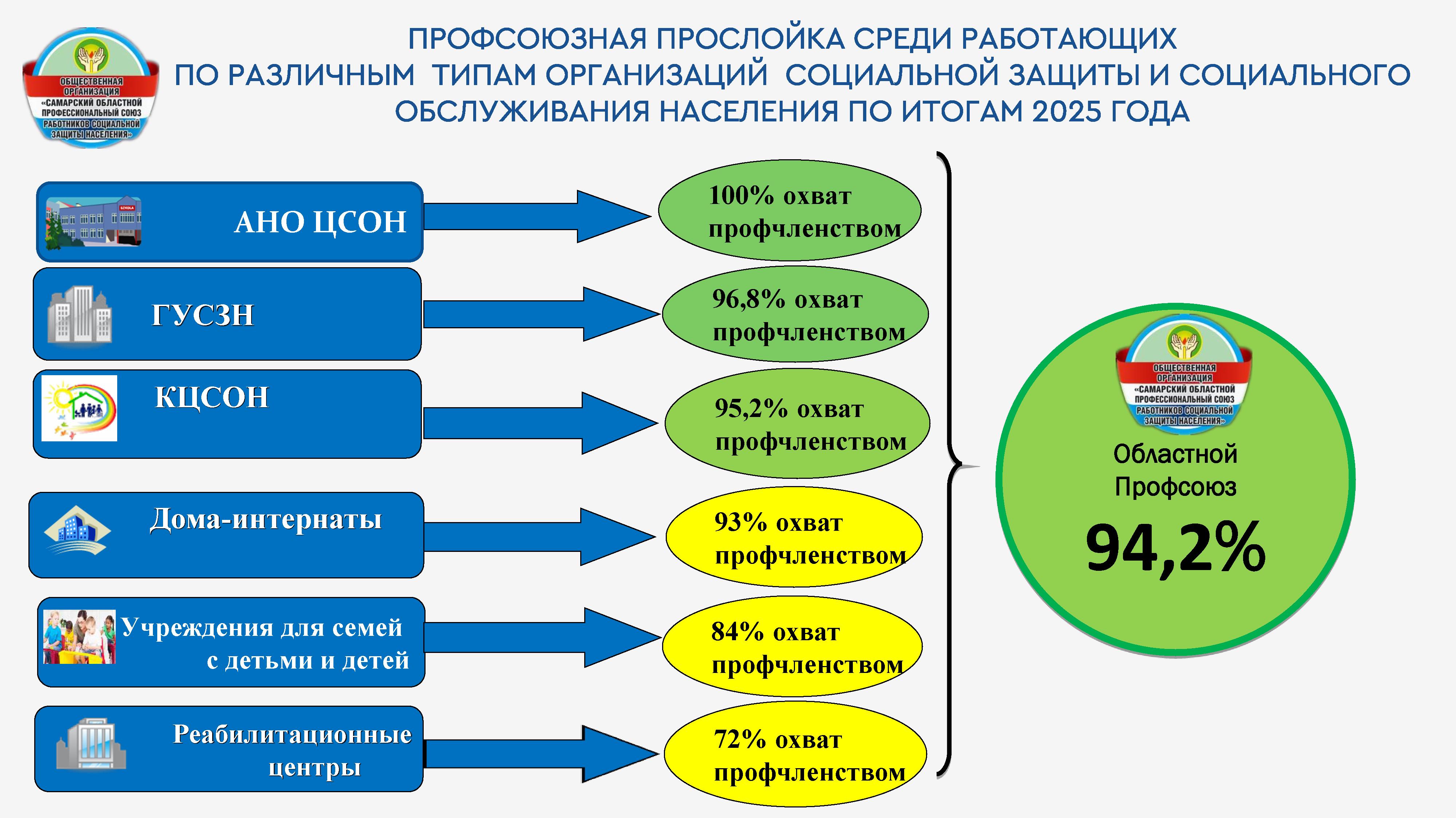 Профсоюзным членством охвачено 100% организаций и учреждений социальной защиты и социального обслуживания от их общего количества.